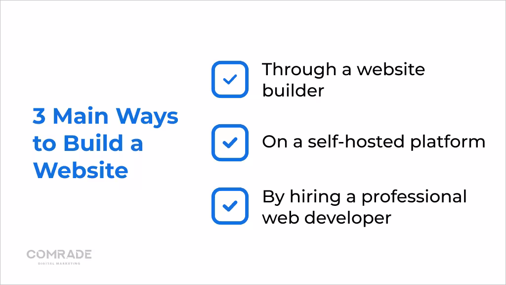 There are three main ways to build a website; 1. Through a website builder with fully managed services (Squarespace, Wix, GoDaddy), 2. On a self-hosted platform (WordPress) or 3. By hiring a professional web developer.