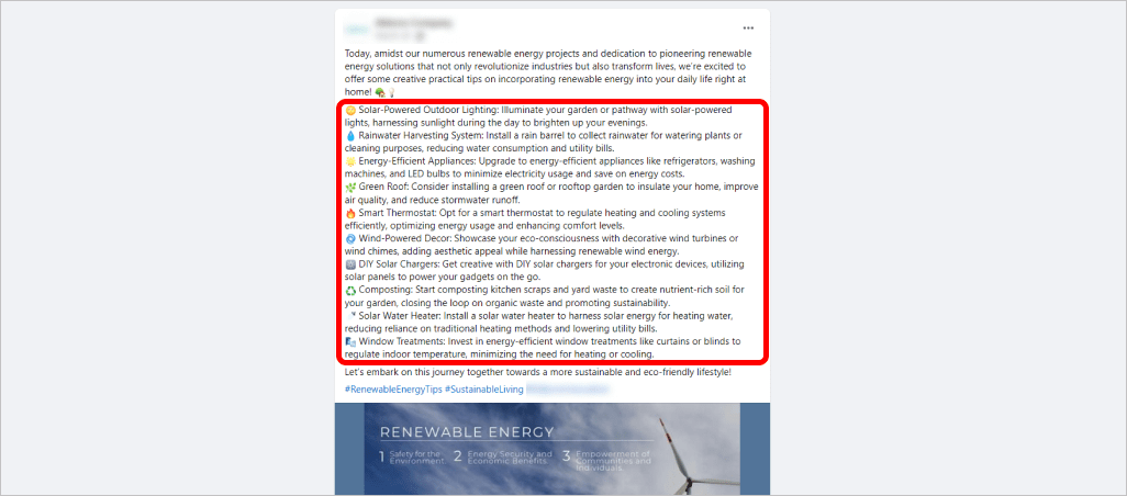 Encourage Interaction: Ask questions or invite your audience to share their experiences related to renewable energy, fostering a sense of community and engagement.