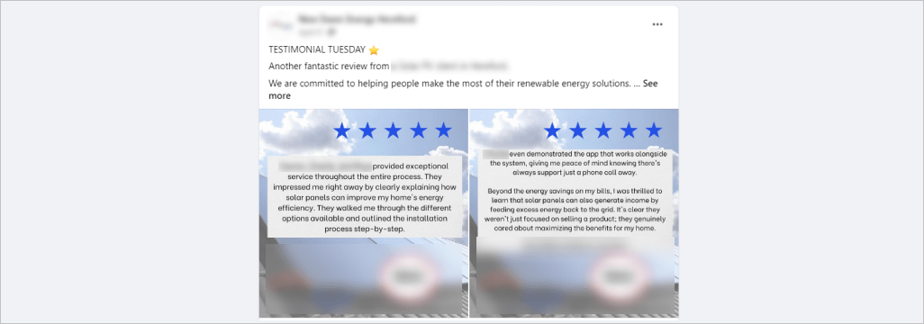 Feature Authentic Reviews: Share genuine testimonials and reviews from your clients, including their names and photos when possible, to add credibility. For example, post a review from a customer who benefited from your solar panel installation services.